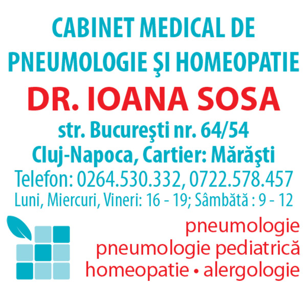 Cabinetul Medical Dr. Ioana Sosa Cluj-Napoca asigură servicii specializate de pneumologie, pneumologie pediatrică, homeopatie, alergologie, dar și alte tratamente dedicate problemelor dumneavoastră de sănătate. Toate problemele aparatului respirator, reacțiile alergice sau alegiile de sezon pot fi diagnosticate și tratate corespunzător în cadrul cabinetului medical.